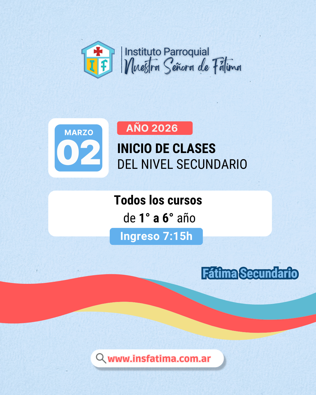 El Instituto Parroquial Nuestra Señora de Fátima informa a su comunidad educativa que el inicio de clases del Nivel Secundario se realizará el día 2 de marzo de 2026.